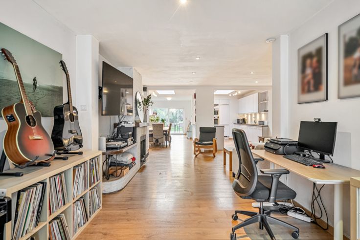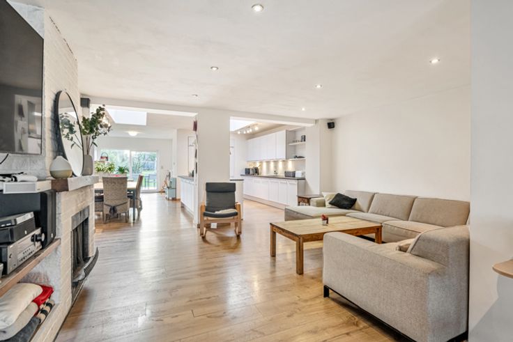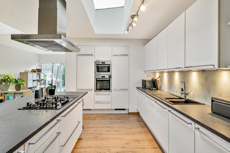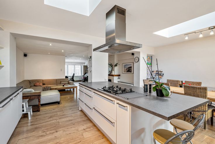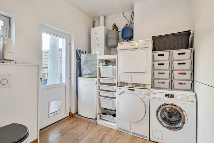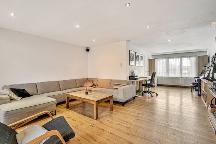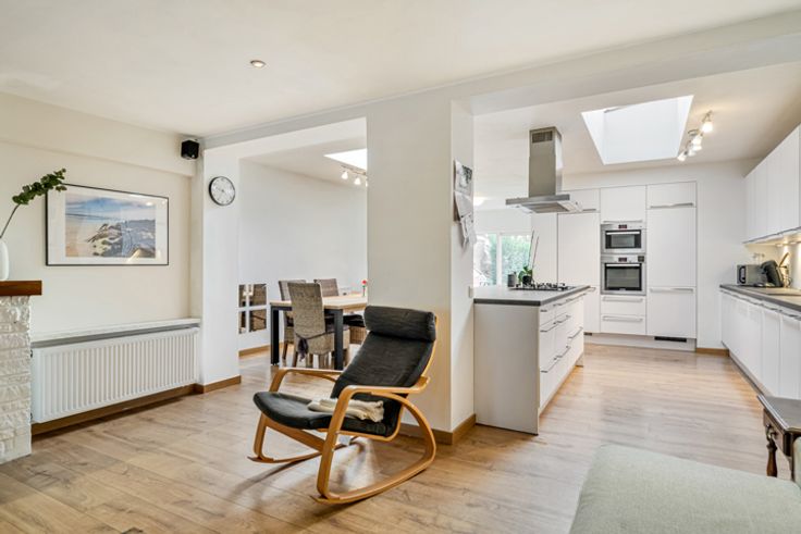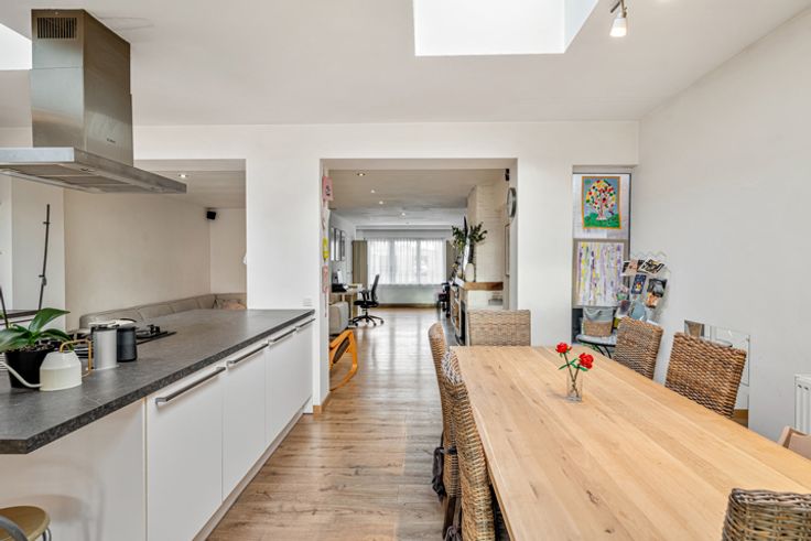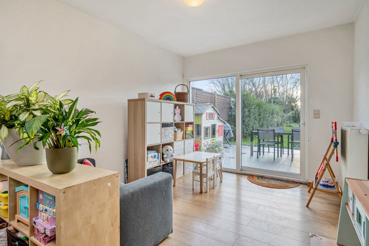 De woning biedt een ruime en lichtrijke leefruimte die naadloos overgaat in een centraal gelegen, grote en volledig uitgeruste keuken. Deze vormt het hart van het huis en biedt voldoende ruimte voor zowel een eetplaats, speelhoek als leesruimte. Achteraan de keuken een praktische berging die u extra opbergmogelijkheden biedt in combinatie met de was voorzieningen.