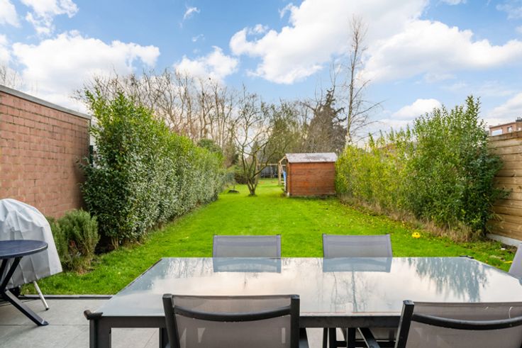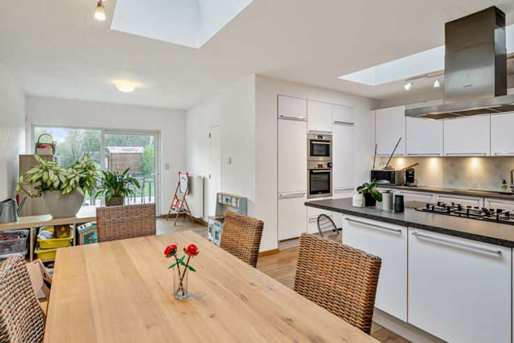 Een grote raampartij thv de achterzijde zorgt voor een directe connectie met het terras en de leuke, gevarieerde tuin, waar u volop kunt genieten het buitenleven.