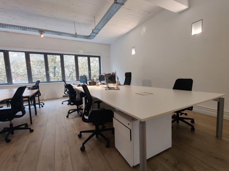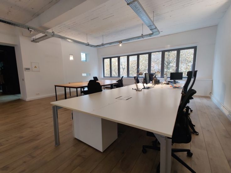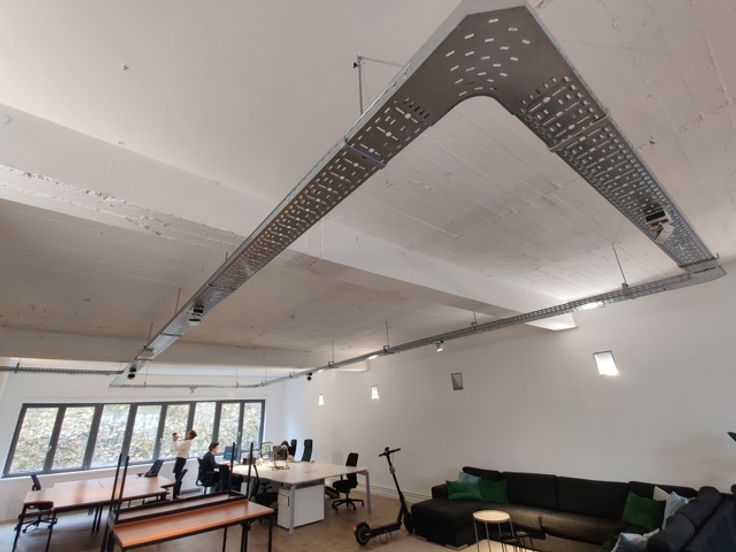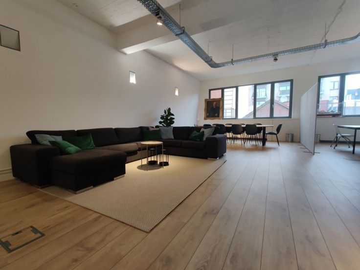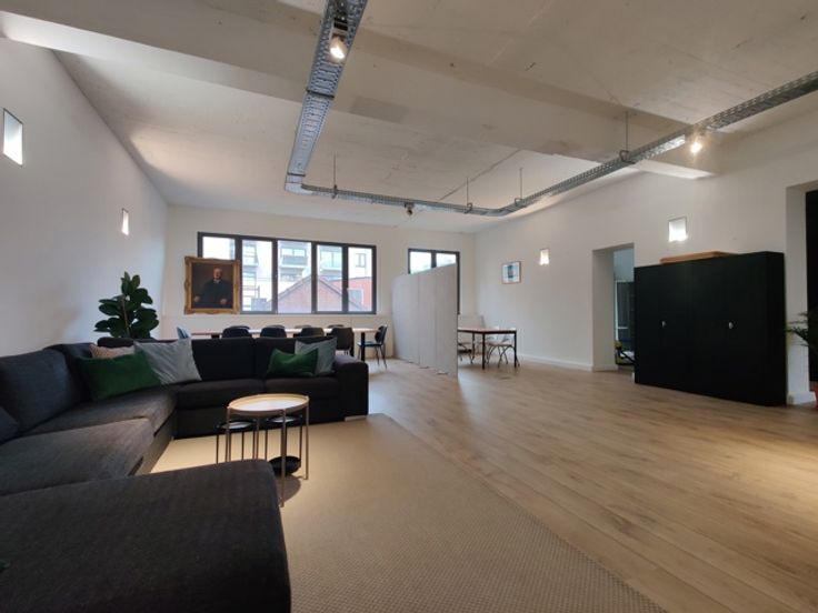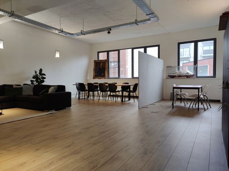 De open landscape-indeling kan eenvoudig aangepast worden aan jouw wensen. De industriële look met betonnen gewelven en stijlvolle spots creëert een inspirerende werkomgeving.