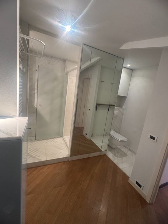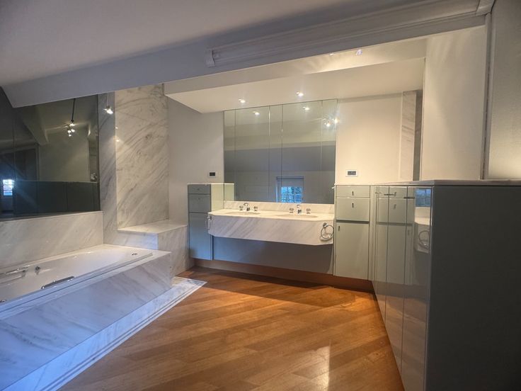 Grote badkamer met dubbele lavabo, douche en toilet