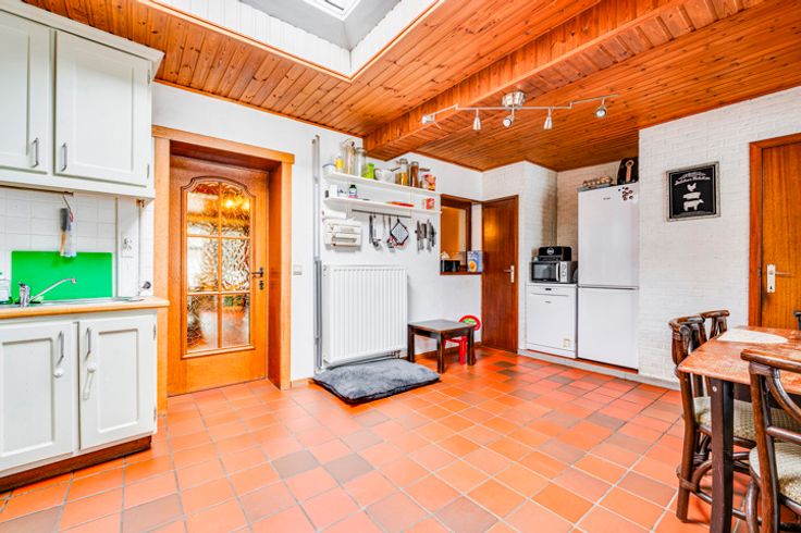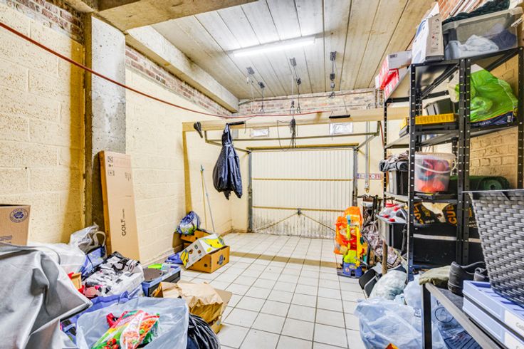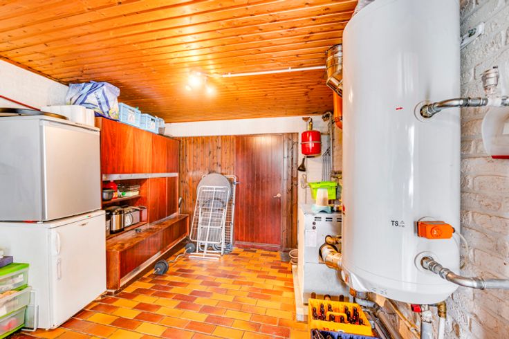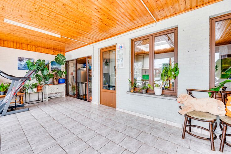 De woning is als volgt samengesteld op het gelijkvloers: inkomhal, ruime woonkamer van 30m², aparte keuken van 17m², veranda van 23m² (ideaal voor een 2e woonkamer, speelkamer, bureau, enz.), apart toilet, berging met stookruimte en grote garage van 24 m².