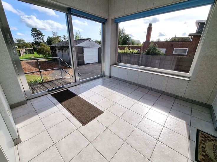 Het gelijkvloers biedt een ruime inkomhal met toegang tot de woonkamer en keuken met beiden een uitzicht op de tuin. Aansluitend aan de keuken grenst een veranda en apart toilet.