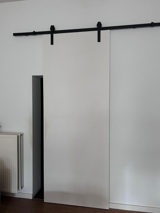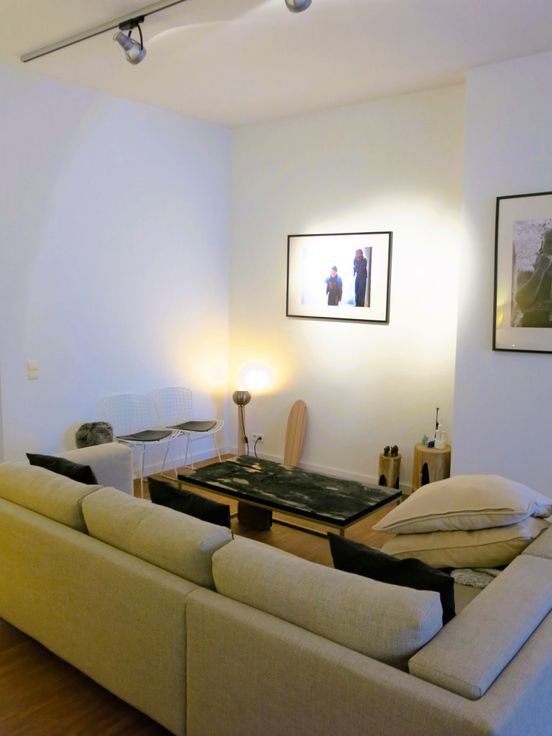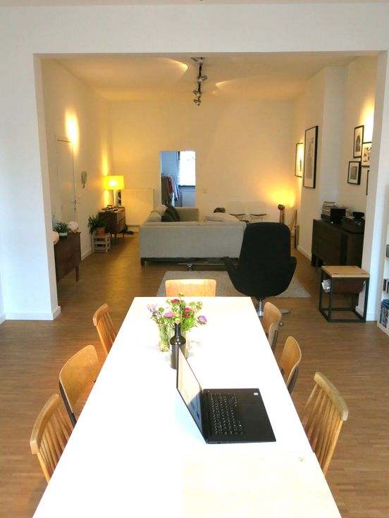 De woonruimte van 52m2 bevindt zich aan de zuidkant en geeft door de grote ramen en hoge plafonds een heel zonnig en ruimtelijk gevoel. Er is voldoende plaats voor installatie van een thuiswerkplek.