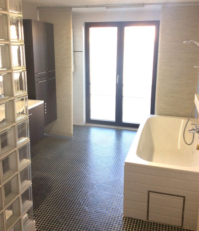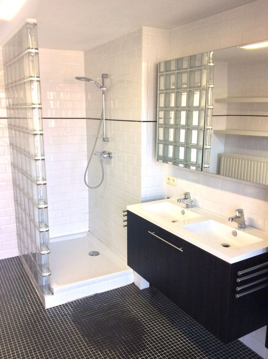 Zeer ruime lichte badkamer met dubbele lavabo, inloopdouche en ligbad. Afzonderlijk toilet.