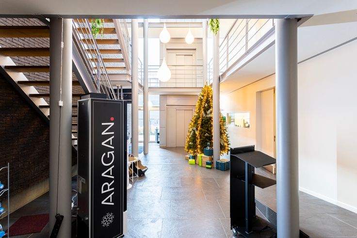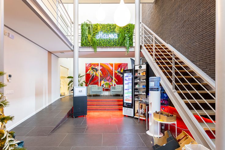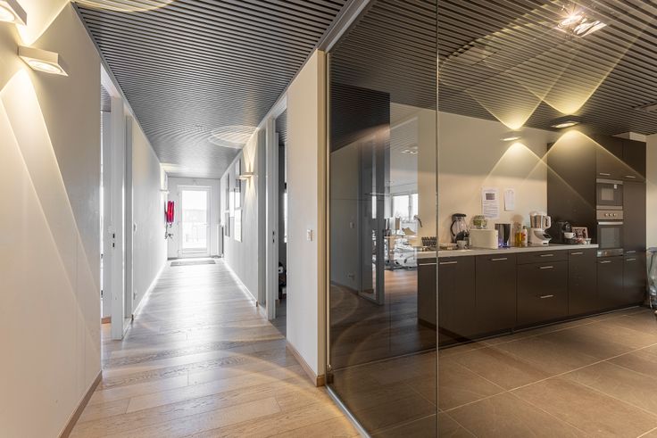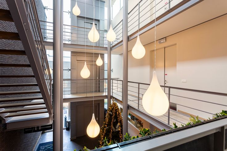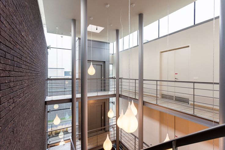 De circulatie tussen de verschillende verdiepen verloopt door middel van de trap die tot helemaal bovenaan de hal loopt, alsook door de personenlift.