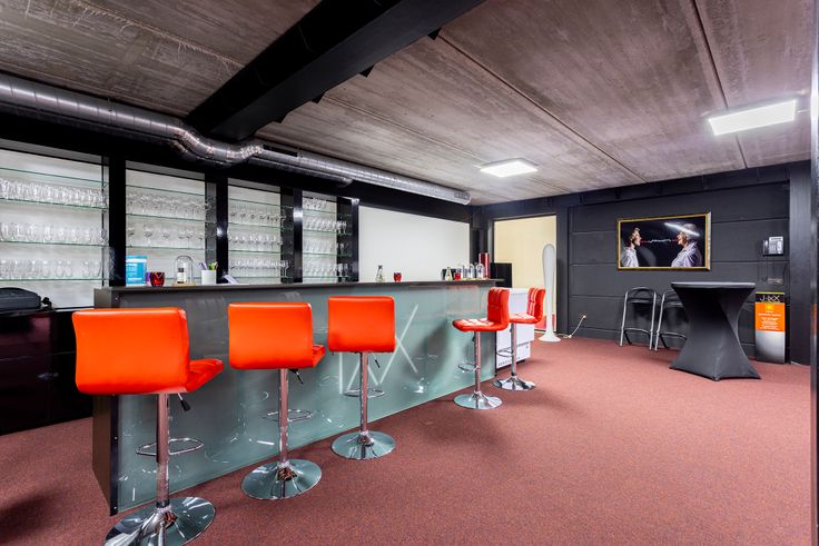 1ste verdieping: Hier bevindt zich de polyvalente ruimte met geïnstalleerde bar. Deze wordt bereikt door de circulatie in de hal.