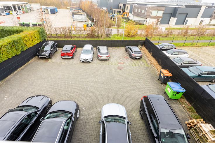 Achteraan het gebouw bevindt zich de parking met 10 parkeerplaatsen.