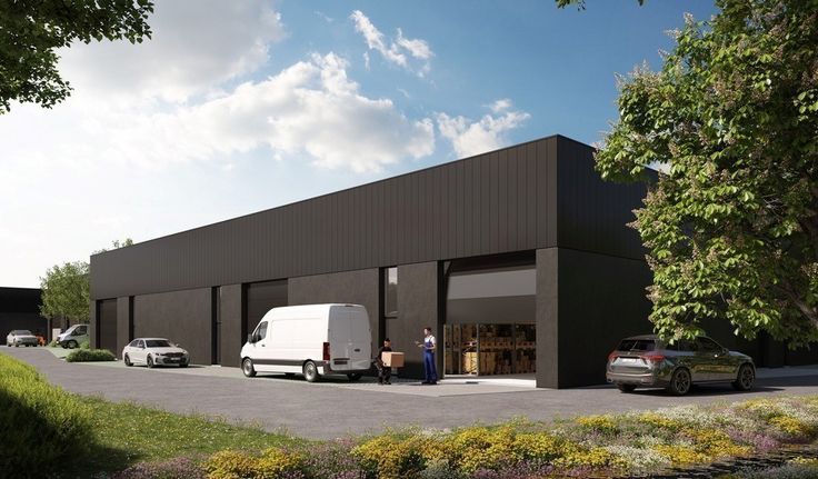 Specificaties: 1 automatische sectionale poort per unit 4m x 4m met led spot boven de poort 48W, 6m vrije hoogte, polybetonvloer, geïsoleerd steeldeck dak met lichtstraat, afvoer sanitair, 32A, septische put 2000l en 1 gemeenschappelijke regenwaterput 10000l, fietsenstalling met 2 laadpunten, 1 parking per unit met wachtbuis voor laadinfrastructuur