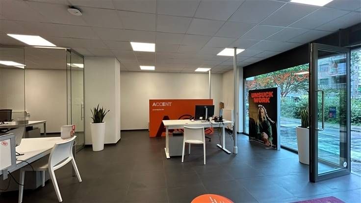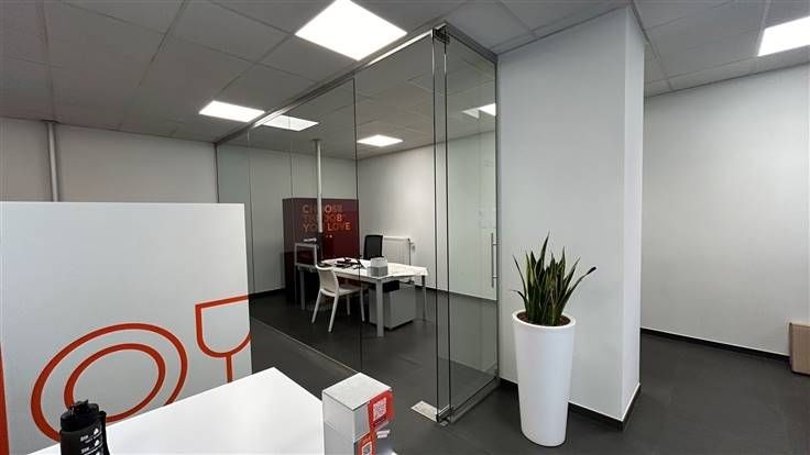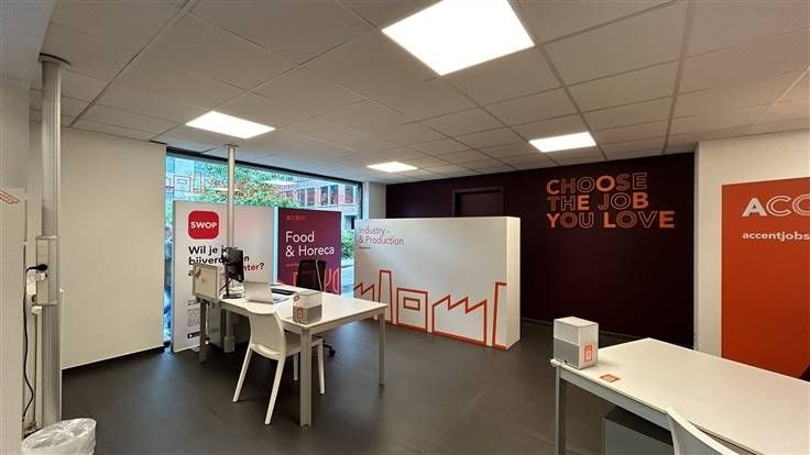 Bij het betreden van het kantoor valt meteen de professionele uitstraling op, dankzij de strakke inrichting en het gebruik van hoogwaardige materialen. De grote raampartijen aan de voorkant zorgen voor veel natuurlijke lichtinval en geven een aangenaam werkklimaat.