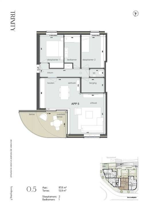 TRINITY STAAT VOOR LICHT - RUIMTE & LUXE! Lanceringsactie, koop een appartement voor 31/10/2024 en ontvangen een leuke extra van de ontwikkelaar! Voor meer informatie, contacteer Jeroen van Immodiest! Een uniek nieuwbouwproject, geeft in Schoot-Tessenderlo vorm aan 7 luxe appartementen en 2 penthouses, die afgewerkt zijn volgens de hoogste standaarden op gebied van esthetiek, comfort en energieverbruik. Appartement 5: Appartement op de 1ste verdieping van 87,6m2 - twee slaapkamers, gezellige leefruimte met toegang tot een oost gericht & deels overdekt terras. Licht doet leven. In Trinity vind je ruime, lichtrijke wooneenheden met één of twee slaapkamers en met oppervlaktes die variëren tussen de 66 en de 124m². De mooie, grote leefruimtes met open keuken, genieten allen een gulle lichtinval. De terrassen vormen een drempelloos verlengde van de leefruimte, met oppervlaktes tussen de 7 en 54m². De hoogste standaarden op gebied van esthetiek, energieverbruik én comfort. De appartementen en penthouses worden op zeer hoogwaardige, luxueuze manier afgewerkt met kritisch oog voor elk detail. Ook de ruime afwerkingsbudgetten zijn een mooie troef van het project. Elk appartement is bovendien klaar voor de toekomst. Dit vertaalt zich niet alleen in een E-peil dat gelijk is aan E20 (50% KI), maar ook door de voorziening van zonnepanelen, warmtepomp, vloerverwarming, … De bewoner staat centraal. Trinity i