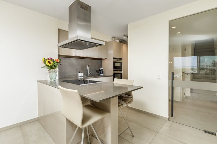 De halfopen keuken met composiet werktablet is volledig uitgerust met toestellen van Siemens: vaatwasser, microgolfoven, bakoven, koelkast, inductie kookplaat en sierdampkap Novy. Aan het kookgedeelte zijn twee zitplaatsen voorzien. Functionele voorraadberging bij de keuken.