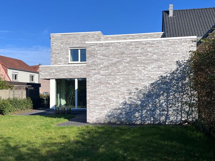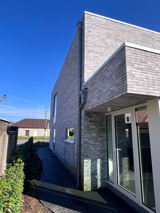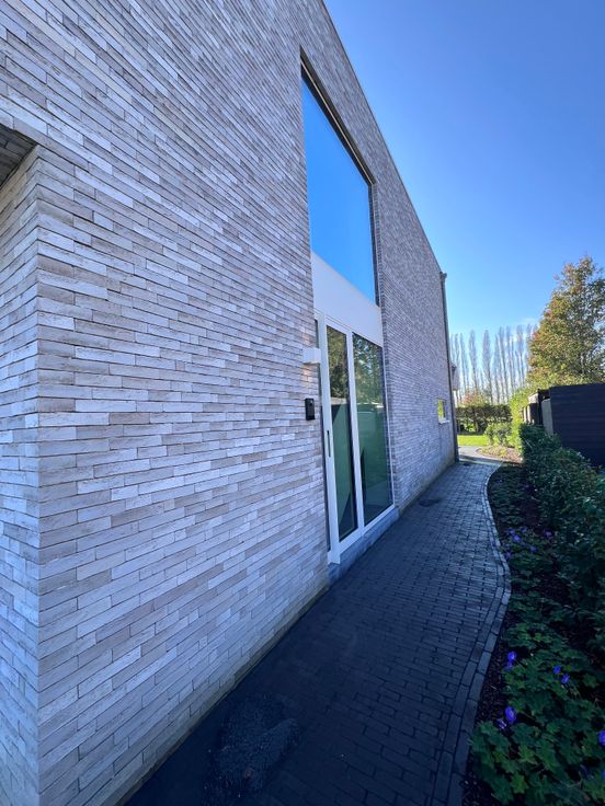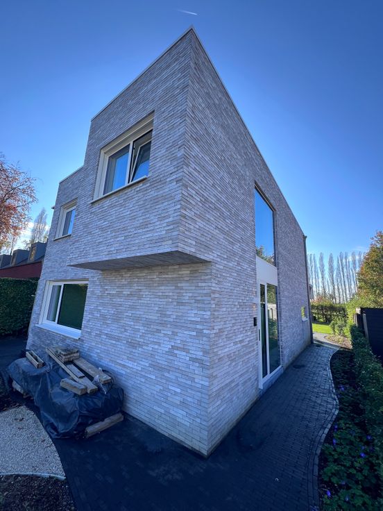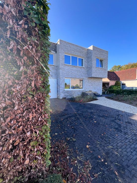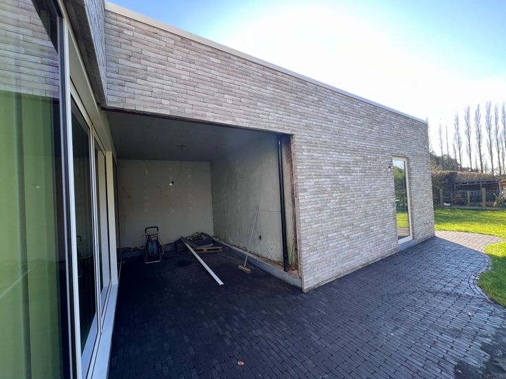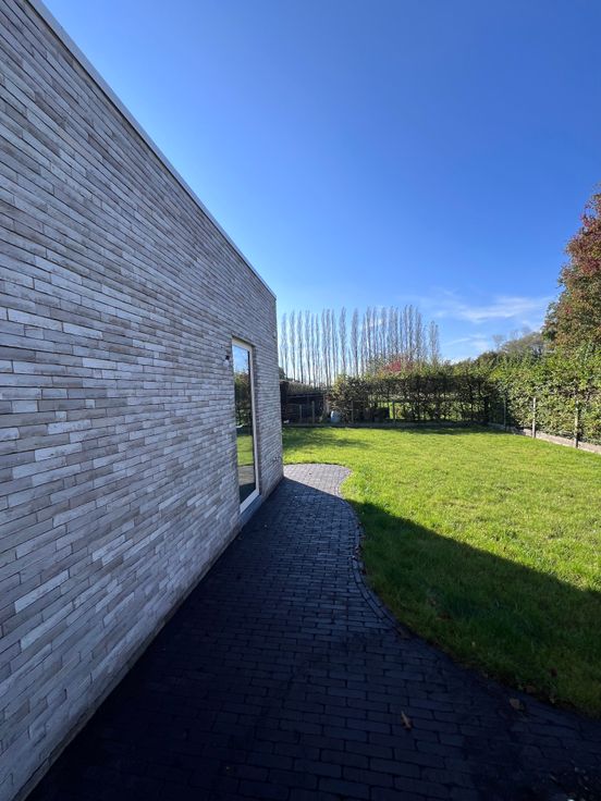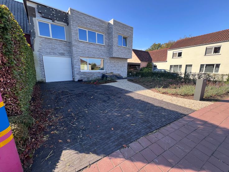 Ook de oprit en het pad naar de voordeur en achteraan werd volledig aangelegd in kleiklinkers.