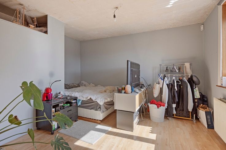 Gelijkvloers: Inkomhal, ruime slaapkamer, lichte woonkamer, open keuken met toegang tot een binnenkoer en een tuin. De tuin beschikt over een aparte fietsenberging met toegang vanaf de straat. Achter de tuin bevindt zich een grote ruimte die na renovatie perfect kan dienen als werkplaats. Verder is er op de begane grond een apart toilet en een badkamer met douche en bad.
