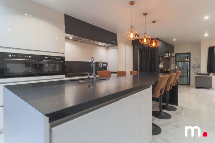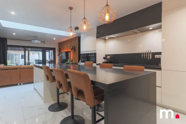 Aansluitend is er de grote lichtrijke leefruimte met volledig ingerichte keuken (2 combi ovens, grote ijskast met daarnaast diepvries, kookplaat, vaatwasmachine,..). Ook is er een praktische berging.