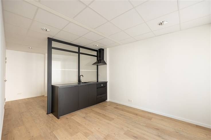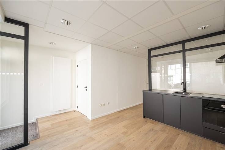 De strakke zwarte open keuken heeft een inductievuur, spoelbak, dampkap, oven, koelkast met vriesvak en een glazen wand die dienstdoet als stijlvolle scheiding tussen het werkgedeelte vooraan, en de tweede ruimte achteraan, die met 10 m² perfect kan dienen als praktijkruimte, voldoende stopcontacten.