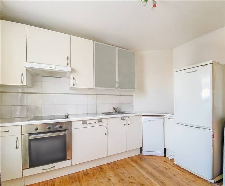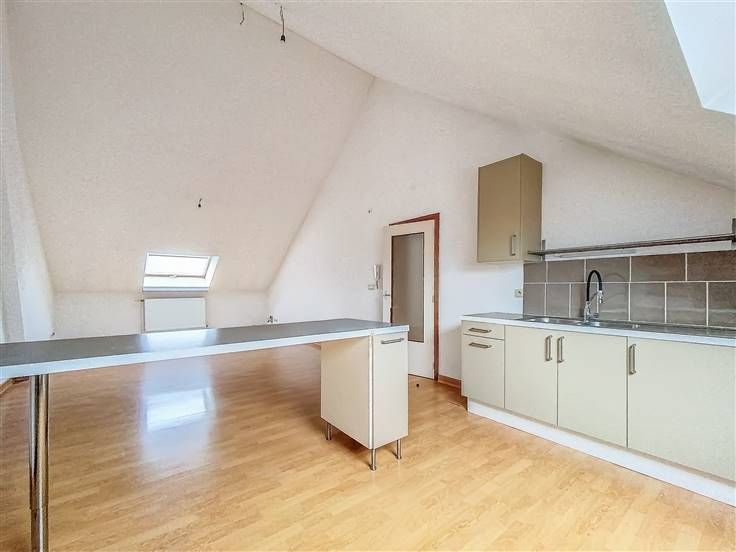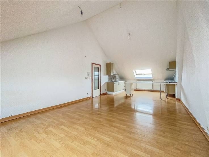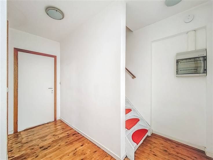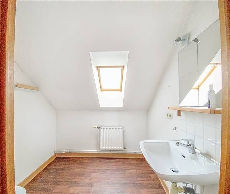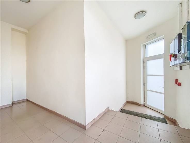 Appartement-duplex 2 en bon état général (+/-91m²): hall, WC séparé, salle de douche, buanderie, spacieuse pièce à vivre avec cuisine, deux chambres, pièce avec WC. Louable de suite. PEB: D-PEB N°: 20241218021053. 4 garages 1V. Jardin.