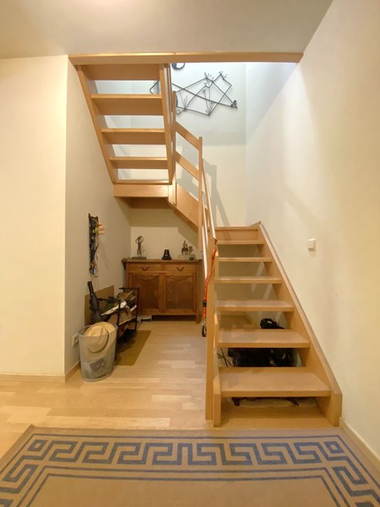 Op de eerste verdieping: inkomhal met ingebouwde vestiaire, living, keuken, wc, berging; terras;