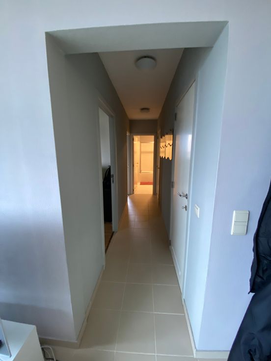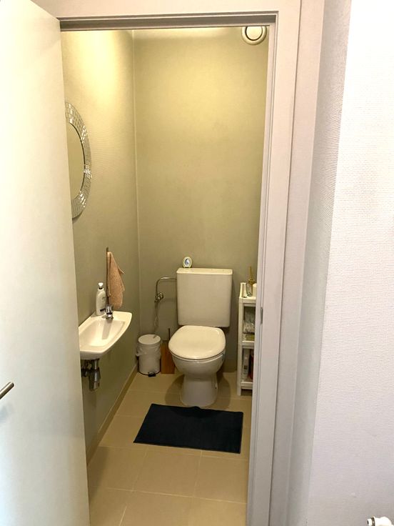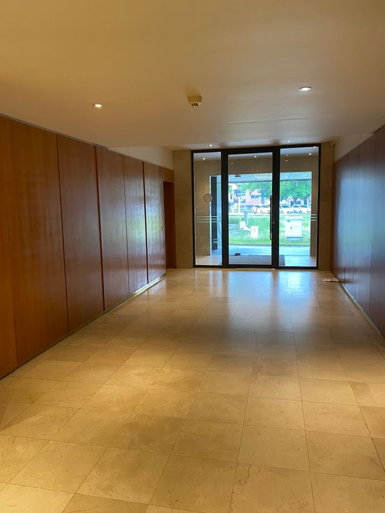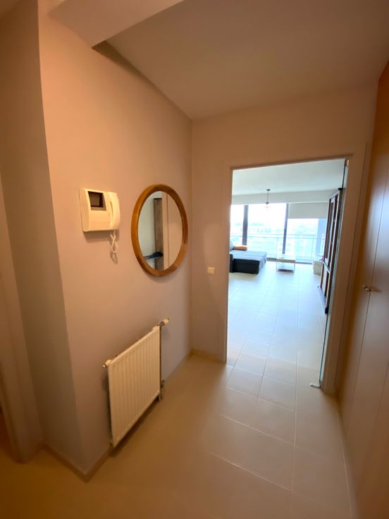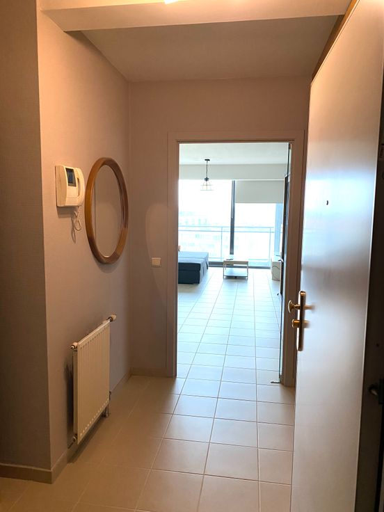 -Inkom met ingebouwde kasten, parlofoon en toilet met een glazen deur gescheiden van de leefruimte.