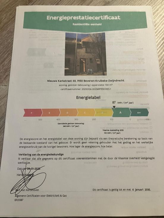 Indeling gelijkvloers : inkom, gastentoilet,badkamer, living met open ingerichte keuken, terras en tuin. Op het eerste verdiep bevinden zich twee slaapkamers. Op het tweede verdiep is er al een extra slaapkamer ingericht met uitschuifbare trap die kan aangepast worden naar een vaste trap. Velux en dak vernieuwd en reeds goed geïsoleerd volgens de nieuwe normen. Rolluiken met elektrische bediening. Extra troef zijn de zonnepanelen met extra dubbele batterij dat ervoor zorgt dat het EPC zeer gunstig is. EPC : 87 kWh/m², label : A. Snel wezen is hier de boodschap. Eigenaars huren op wandelafstand van de woning twee autostaanplaatsen die kunnen worden overgenomen. Voor het adres of een bezoek, gelieve Ilse te contacteren op 0486093001 ajb.