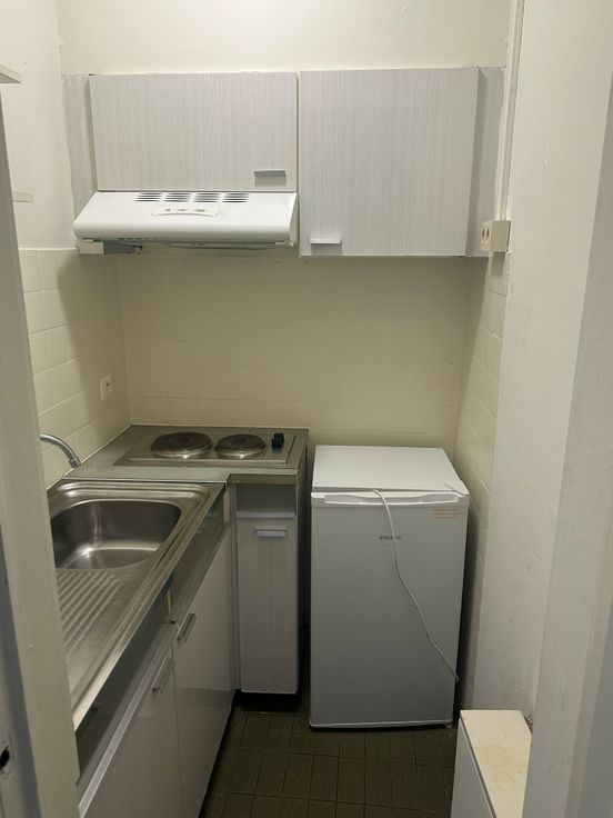 De afsluitbare keuken is voorzien van enkele kasten, een dubbele elektrische kookplaat, een wastafel en een koelkast.