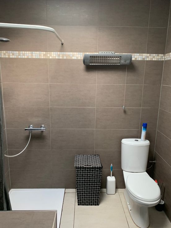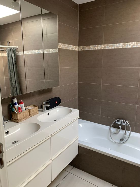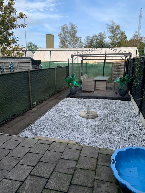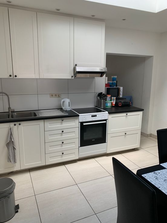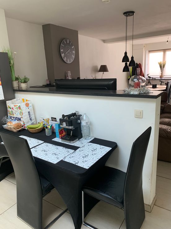 Gelijkvloers: leefruimte met half-open ingerichte keuken, wasstraat (aansluiting wasmachine, droogkast,diepvries,frigo...), badkamer (bad en inloopdouche, toilet en dubbele lavabomeubel), bergplaats voor fietsen en tuinmateriaal, terras en tuin (40m², Noord-Oost gericht), fietsenpad via achteruitgang naar de tuin. Mogelijk om te parkeren voor de woning en achter de woning