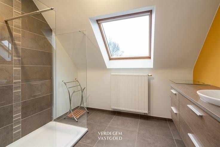 Ligging Hier maak je deel uit van een ondernemende regio en woon je omringd door historisch groen. De gemeente zet in op beleving, wandelen en fietsen, waardoor heel wat jonge gezinnen er hun weg vinden. Er is een lagere school, R4 en Gent zijn vlot te bereiken, alsook het veer van Terdonk en Langerbrugge. Openbaar vervoer (bus) is op wandelafstand. Energiezuinige woning met weids zicht en tuin Voel je meteen welkom en betreed de inkomhal met gastentoilet. Via de glazen deur kom je in de lichtrijke woonkamer. Deze is heel ruim met zithoek aan de haardcassette, eetplek, apart bureau en open keuken. Er is heel wat lichtinval en een groot schuifraam brengt je naar het terras. Verder is er het comfort van een wasplaats met achterinkom en een koele berging. Op de verdieping zijn er 2 grote slaapkamers, elk met badkamer, ruimte voor dressing en een apart toilet op de nachthal. Een derde slaapkamer kan gecreëerd worden via een af te werken zolder. Een heerlijke buitenruimte met volwassen groen (ca. 1500m²) maakt het geheel af. Via een aan te leggen oprit links rijd je rechtstreeks naar de tuin, waar een garage kan geplaatst worden. Mogelijkheid tot kangoeroe-wonen: woning nr. 64 is eveneens te koop. Troeven / EPC label A / zonnepanelen / instapklaar / rustige ligging / ZO tuin / mogelijkheid aankoop 2de woning Contacteer Niels voor meer informatie: 0476 02 94 40 of via niels@verdegemvastgoed.be
