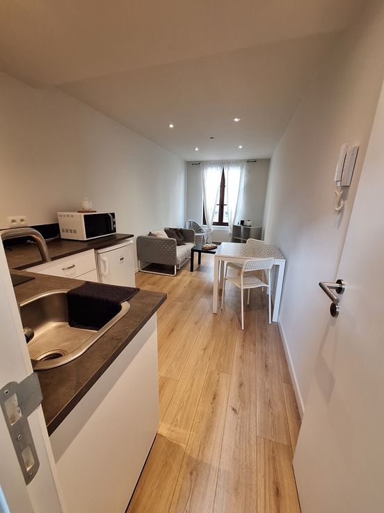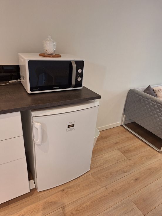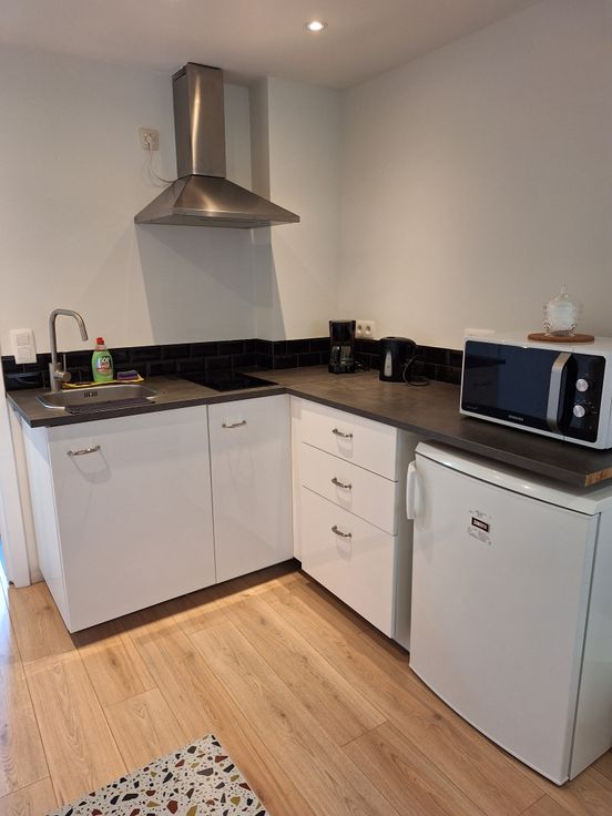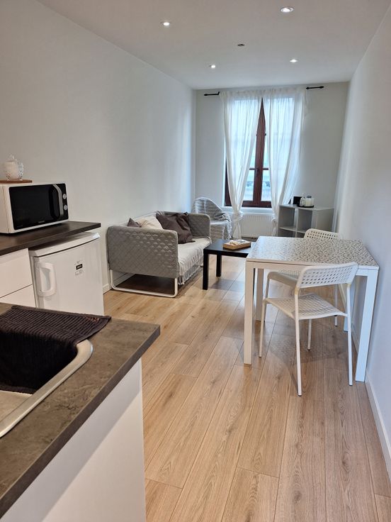Au 3ème étage, vous découvrirez une agréable pièce à vivre, agrémentée d'une kitchenette équipée avec réfrigérateur, micro-ondes, machine à café et bouilloire.