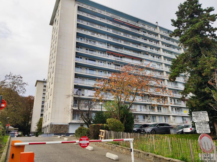Entrée sécurisée avec badge, garage à vélo et parc privé.