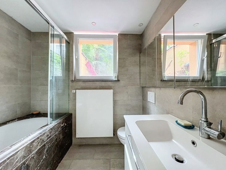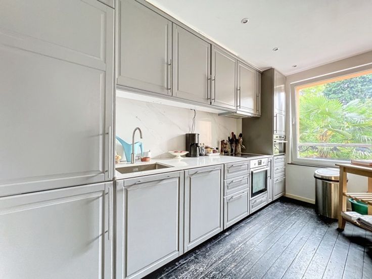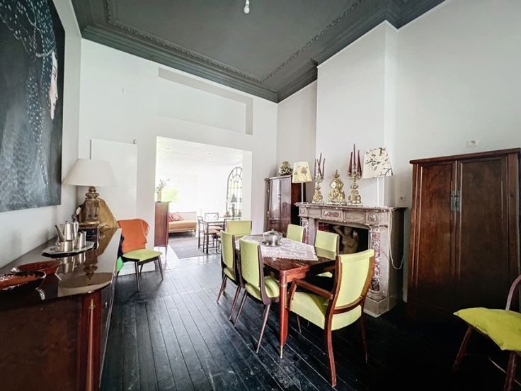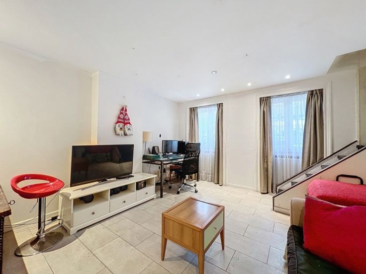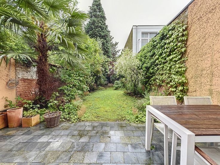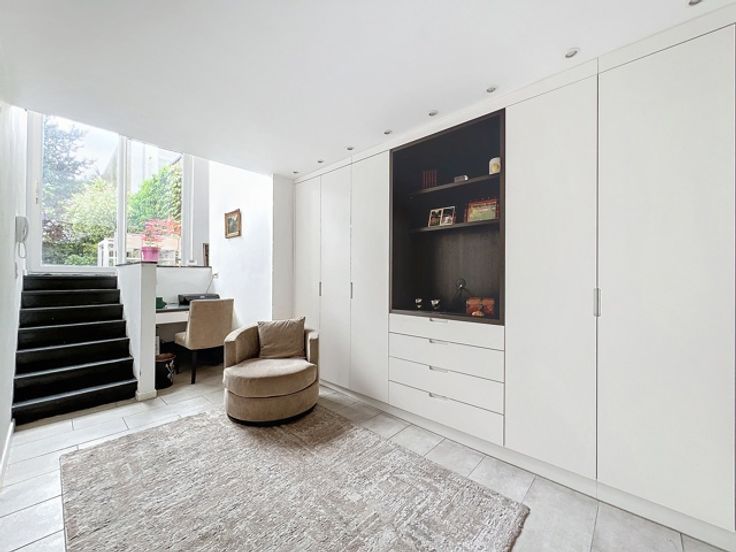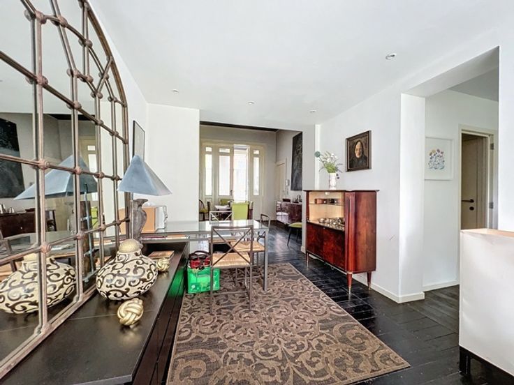 Deze duplex spreidt zich uit over de belle étage en sous-sol van een herenhuis aan het Elisabethpark. Op de belle étage zijn er drie leefruimes met hoge plafonds in enfilade, met aan de tuinkant een aanpalende keuken. Een trap met ramen op dubbele hoogte leidt van de woonvertrekken naar het benedenverdiep. Vanaf de tuin heb je eerst de master bedroom met een kastenwand, kleine bureau, en een badkamer met bad. Via een dubbele deur kom je in de tweede slaapkamer die overgaat in een speelkamer of bureauruimte aan de straatkant. De kastenwand van de tweede slaapkamer opent naar een badkamer met toilet en douche.