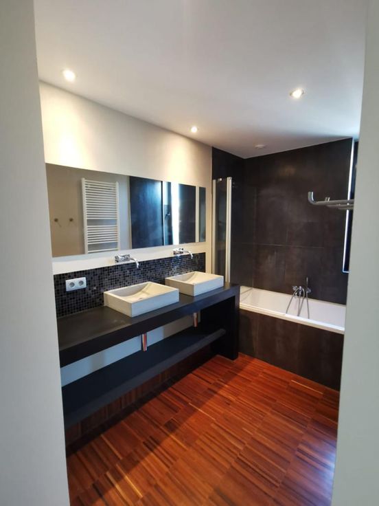 Modern loft-stijl appartement in een zeer unieke setting. Appartement bestaat uit 2 verdiepingen en bevindt zich op de bovenste verdiepingen van het gebouw. Enorme woonkamer met 5m hoge plafonds, 3 slaapkamers - 3 badkamers, volledig uitgeruste open keuken met aparte ontbijtbar. Wasruimte en veel ingebouwde kastruimte. Groot terras (40m) op de 2e verdieping.