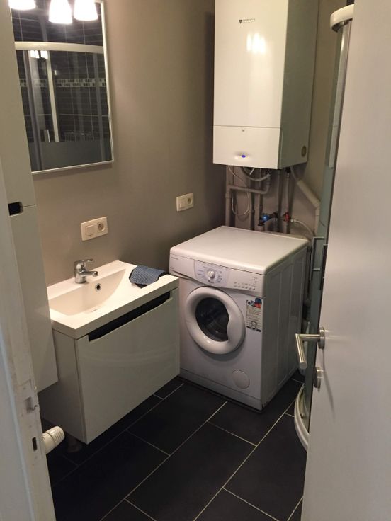 Badkamer met douche met aansluitingen voor wasmachine