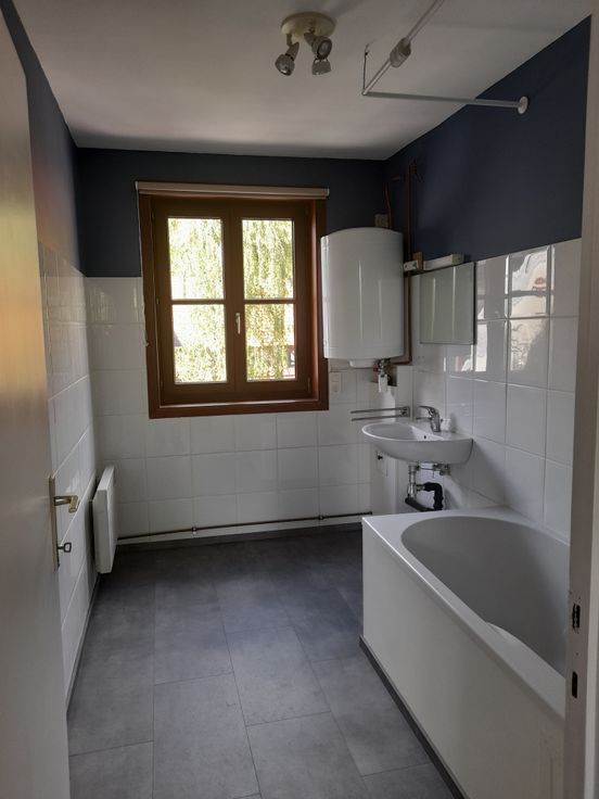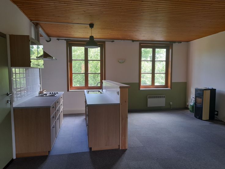 De keuken beschikt over een electrische kookplaat en een waterboiler, er is eveneens plaats voorzien voor een vaatwasser en een hoge koelkast.