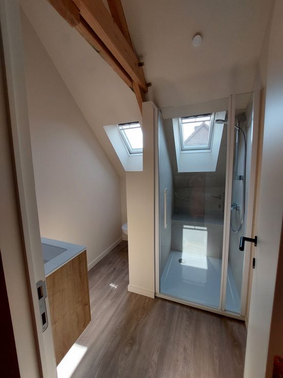 Op de verdieping zijn 2 slaapkamers en 1 badkamer.