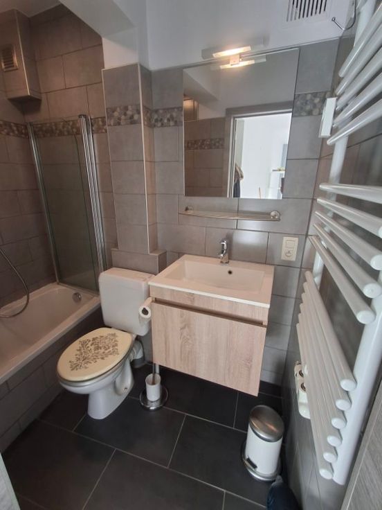 A louer, studio comprenant : hall d'entrée, salle de bain avec baignoire-douche, lavabo et wc, cuisine équipée, salle de séjour. Entièrement carrelé. Nouveaux chassis. Nouveaux radiateurs avec vannes thermostatiques. Radiateur sèche-serviettes. Cave privative. Prises téléphone et internet. Partiellement meublé : lit + bibliothèque.