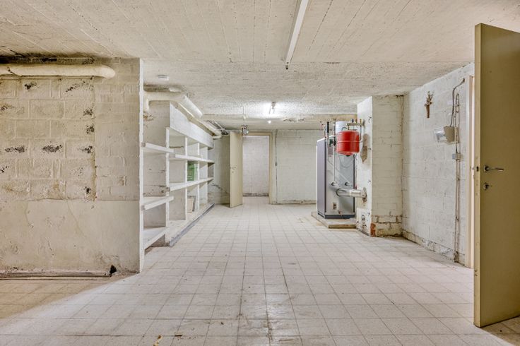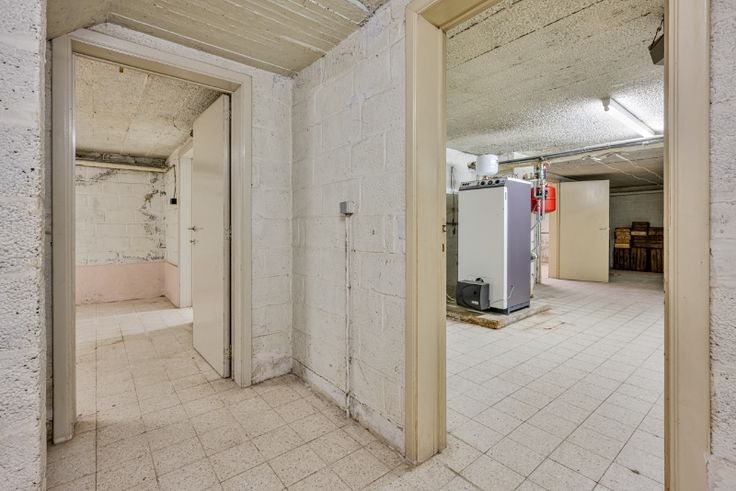 Deze woning heeft een volledige kelderverdieping met diverse bergingen, cv ruimte (verwarming op mazout) en garage voor 1 wagen. De inpandige garage is bereikbaar via de achterkant van de woning.