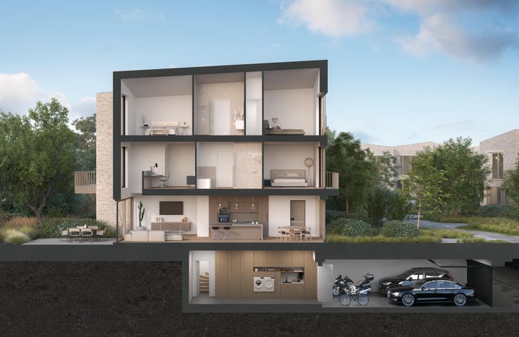 Vanuit de ondergrondse garage, waar je minimaal twee auto’s kunt parkeren, heb je directe privétoegang tot je woning. De garage geeft toegang tot een fraai afgewerkte kelderruimte met een praktische vestiaire, een wasplaats, een berging en een handige afspuitplek voor fietsen. Op het gelijkvloers geniet je van een gastentoilet, een ruime en lichtrijke living, een eetplaats en een open keuken. Aansluitend vind je grote, zonnige terrassen van minimaal 19 m², georiënteerd op het zuiden of westen, waar je heerlijk kunt ontspannen. De eerste verdieping biedt een slaapkamer, een bureauruimte, ee...