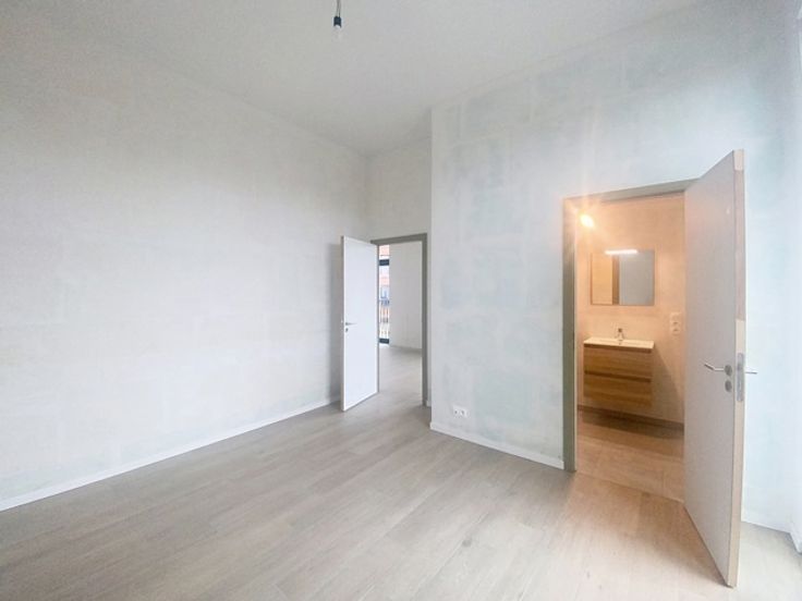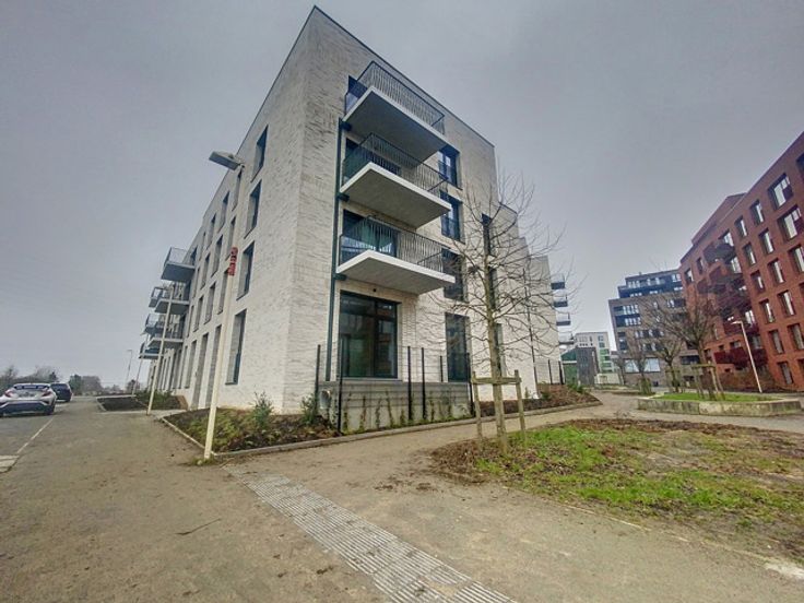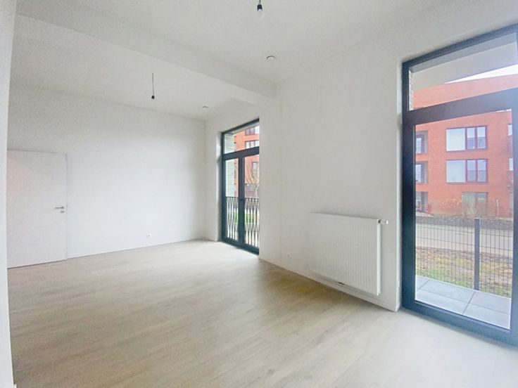 Nieuwbouwappartement op de gelijkvloerse verdieping, voorzien van een terras en een ruime slaapkamer.