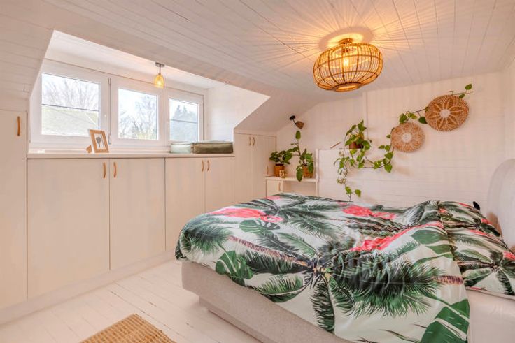 1V: nachthal; 2 slaapkamers waarvan één met ingemaakte kast; vaste trap naar de zolderverdieping (in te richten als 3e slaapkamer).