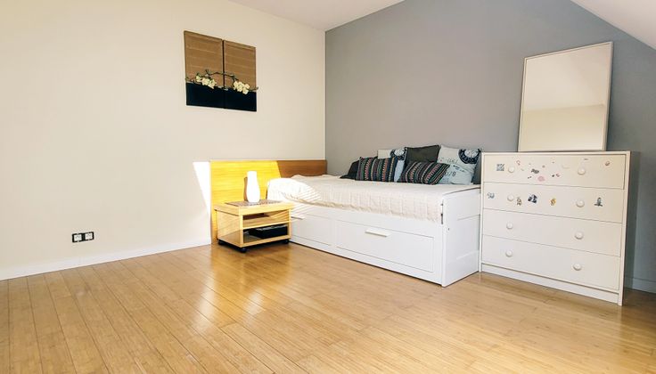 1er étage: 3 chambres (16, 11 , 9,5 m²), dont une équipée d’un grand dressing sur mesure, sdb spacieuse 9 m² (avec douche, baignoire et meuble lavabo), et un WC séparé avec lave-mains. Toutes les chambres sont dotées d’un parquet en bambou massif verni.