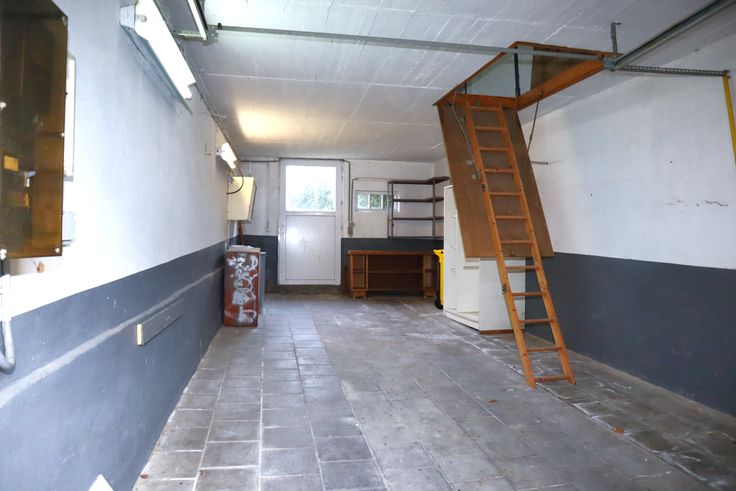 Un garage avec un grenier au-dessus de celui-ci.