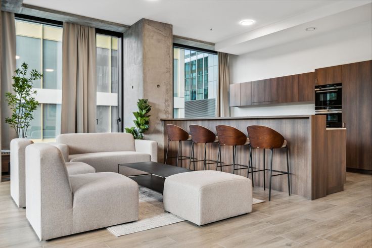 Nos appartements élégants et modernes offrent le meilleur des deux mondes. Cela signifie que vous profiterez de l'intimité de votre propre chambre tout en partageant des espaces communs avec vos colocataires, notamment un salon et une salle à manger, une cuisine, des salles de bains communes et un balcon commun.