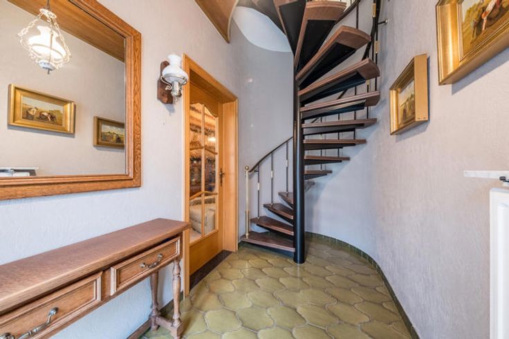 De draaitrap in de inkomhal geeft toegang tot de eerste verdieping waar zich vier slaapkamers en een badkamer voorzien van lavabo, ligbad en toilet bevinden.