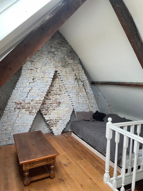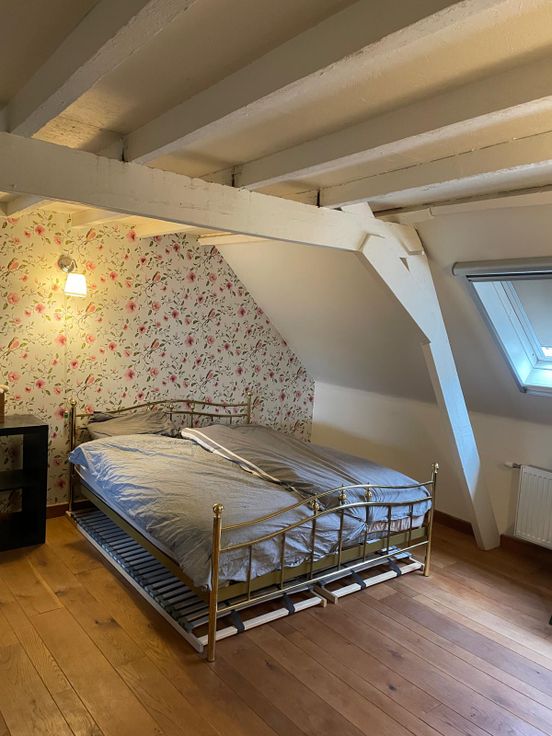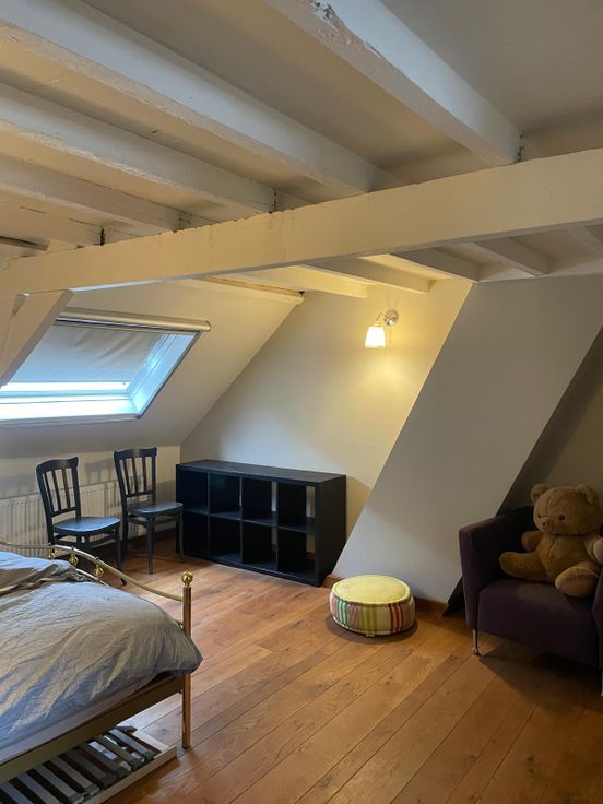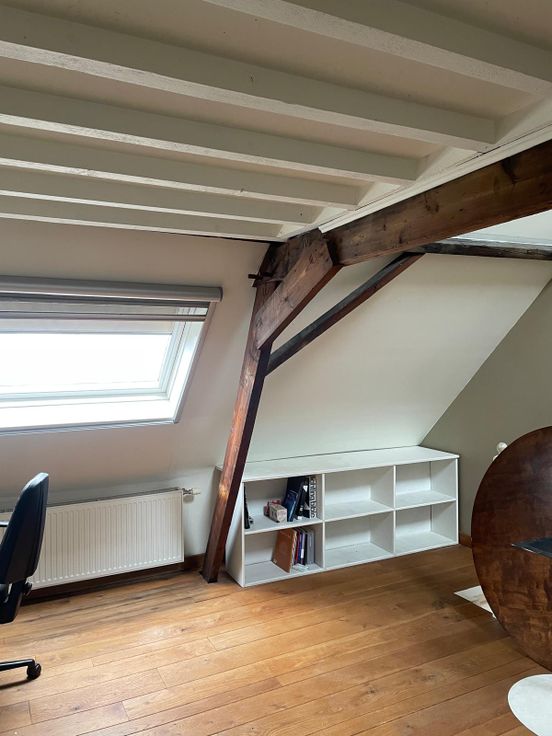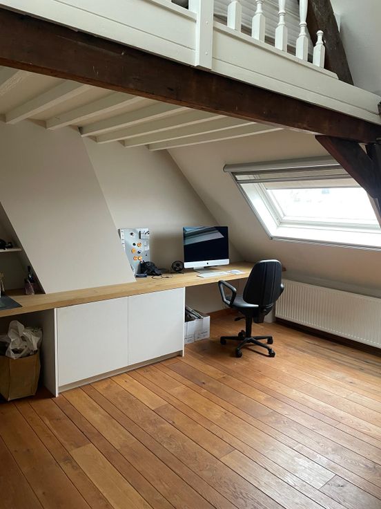 Tweede verdieping: grote slaapkamer en bureauruimte met mezzanine (momenteel ingericht als logeerkamer).