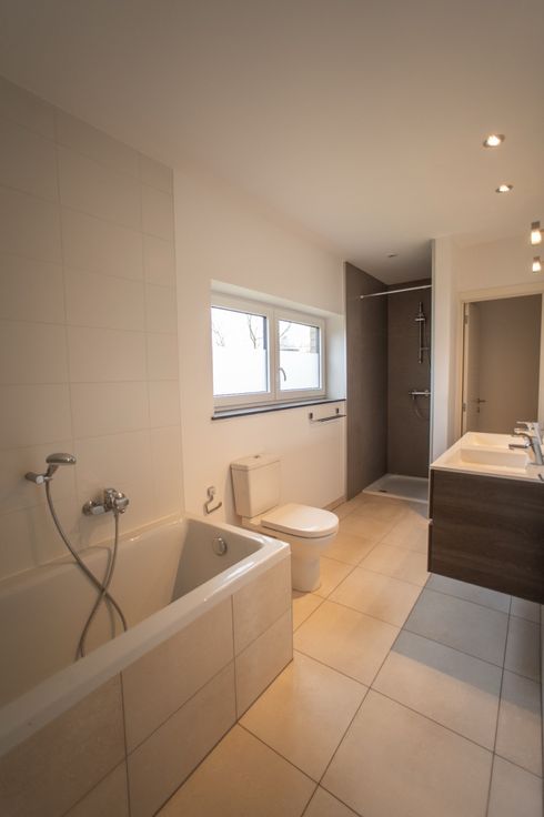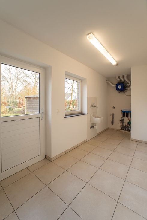 Via de inkomhal met gastentoilet betreden we de zeer ruime en lichtrijke woonkamer met een volledig uitgeruste open keuken. Hiernaast bevindt zich een handige berging/wasplaats/technische ruimte. Zowel vanuit de keuken als berging heb je toegang tot het terras en de tuin. Op het gelijkvloers is nog een extra ruimte die o.a. kan gebruikt worden als kantoor ruimte.