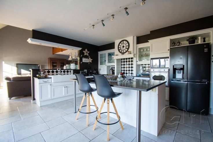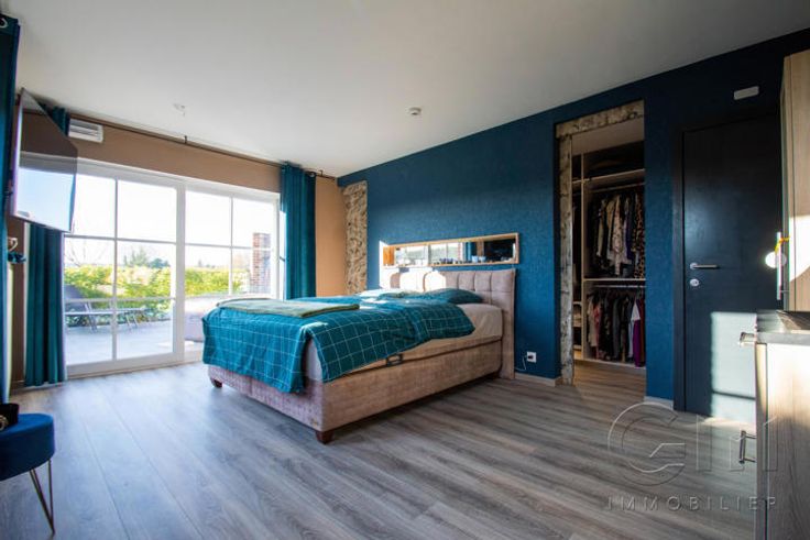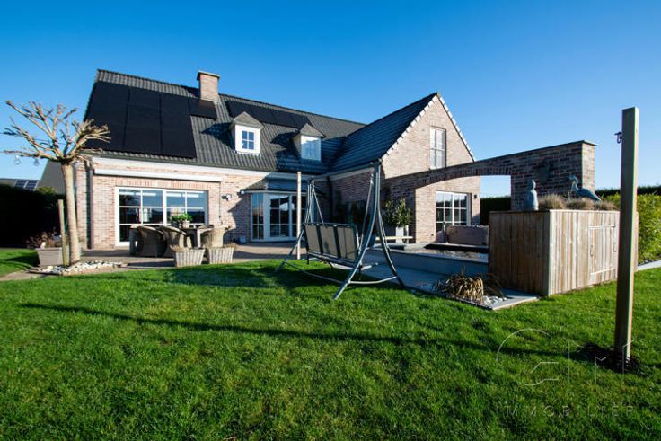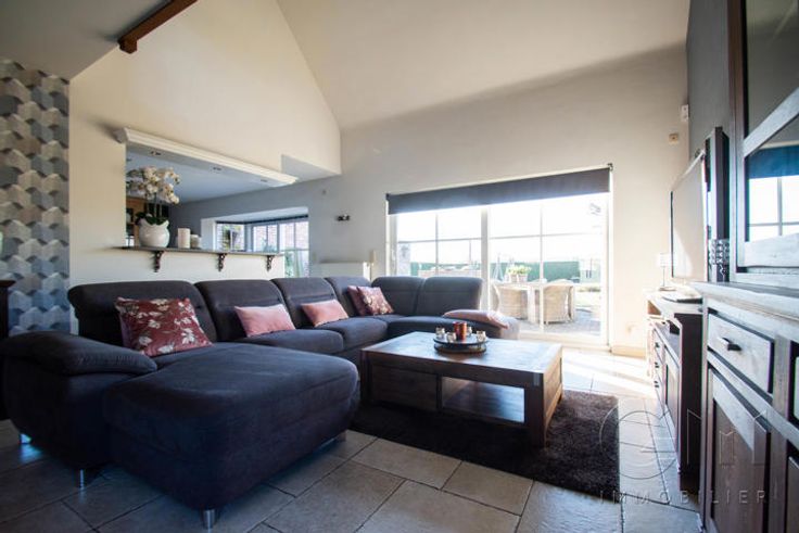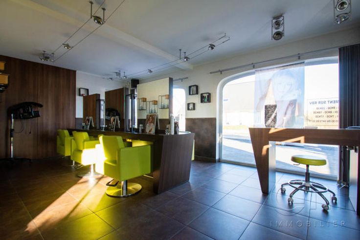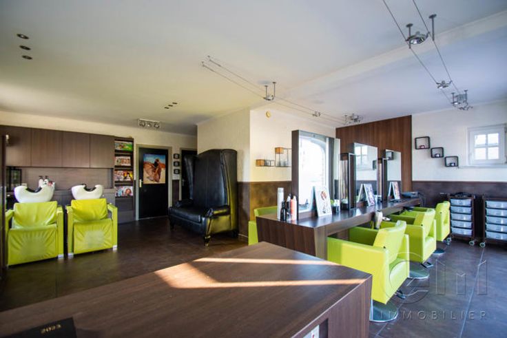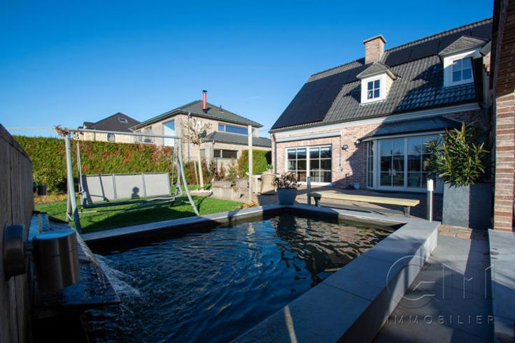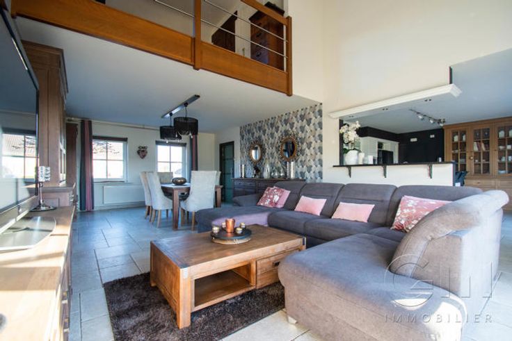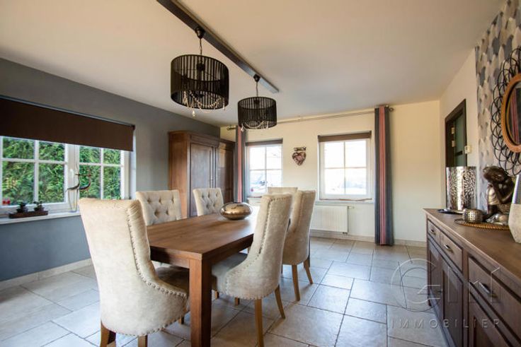 * Au rez-de-chaussée : Hall d'entrée avec escalier apparent, spacieux et lumineux séjour avec espaces salon et salle à manger donnant sur une cuisine full-équipée (four, hotte et lave-vaisselle de marque "SMEG", taque au gaz, double évier et mobilier de rangement) avec espace repas sur ilôt, le tout en granit. WC séparé, buanderie, surface commerciale de +/- 40m² (actuellement salon de coiffure) avec accès indépendant, suite parentale (chambre, dressing, douche à l'italienne et WC), avec accès indépendant sur la terrasse (anciennement institut de beauté). Grande terrasse avec étang donnant sur un magnifique jardin entièrement clôturé et arboré. Parking privé face à l'habitation pouvant accueillir jusqu'à 7 véhicules et espace latéral aménageable en carport.
