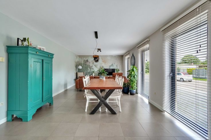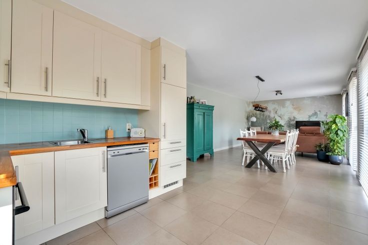 Via de inkomhal komen we binnen in een open ruimte waar zowel zit- als eetkamer zich bevinden. De keuken is naadloos verbonden met de woonkamer. Deze is voorzien van alle moderne apparaten zoals onder andere een elektrische kookplaat, ingebouwde koelkast, afwasmachine en combi-oven.
