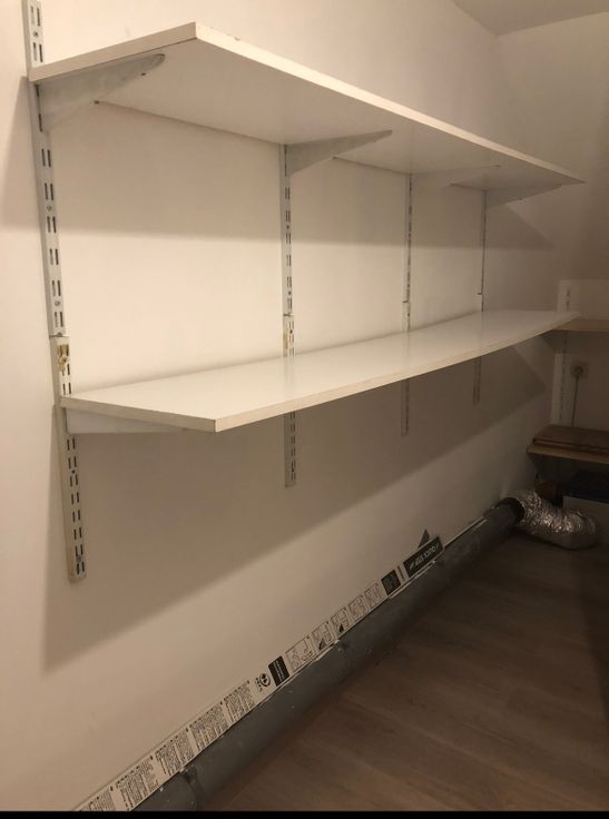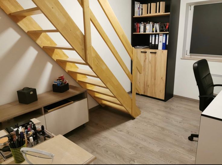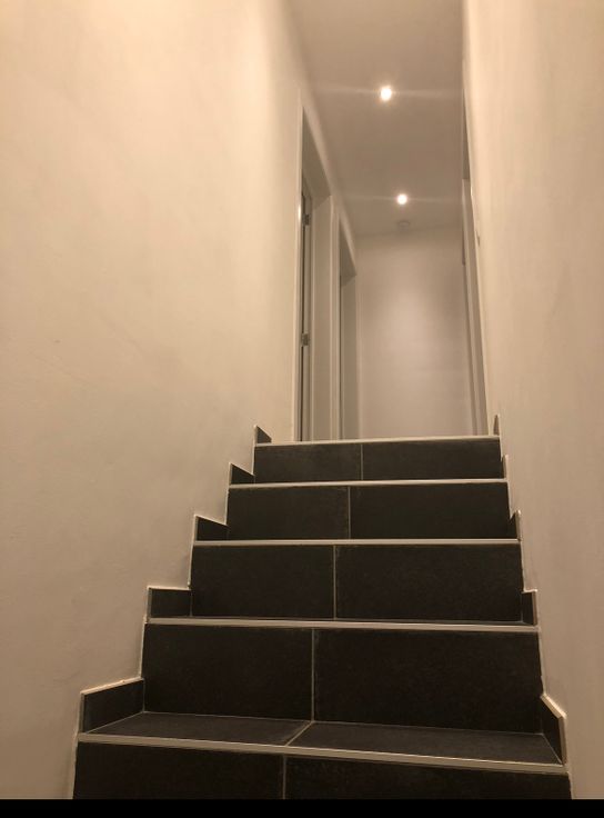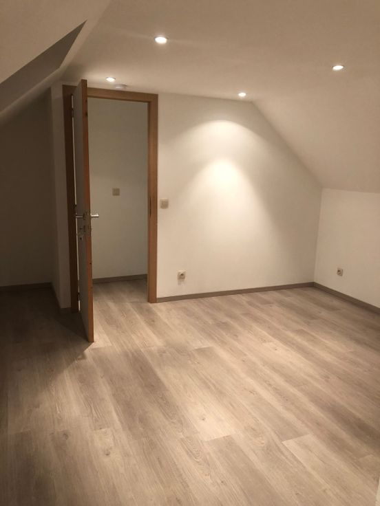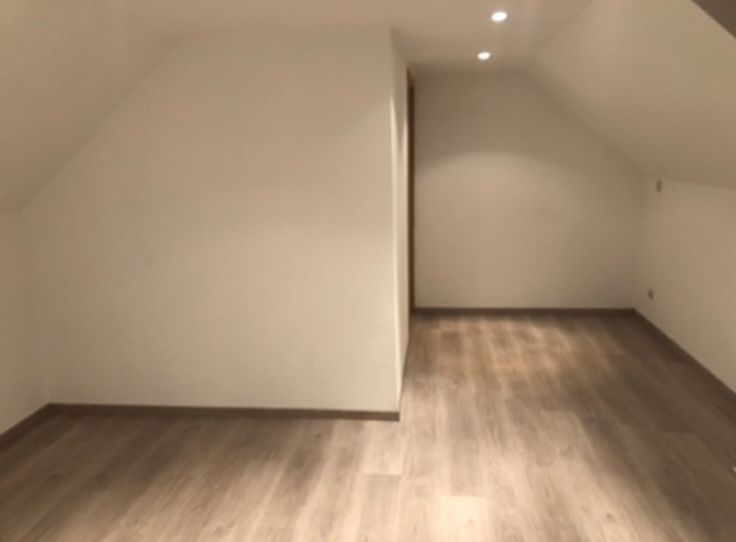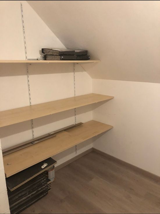 Escalier donnant sur une grande chambre parentale avec placard intégré. Une plus petite chambre, un bureau avec accès à un autre étage avec une grande chambre et un petit grenier aménagé avec des planches pour y ranger pas mal de choses.