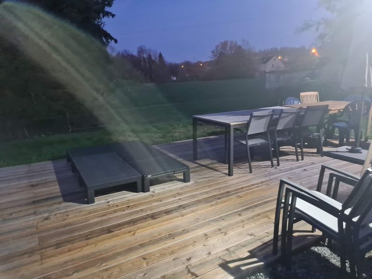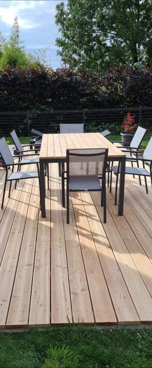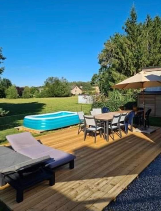 Jardin donnant sur un champs au calme - peu d'entretien de jardin + grande terrasse en bois + 2 abris en bois pour tondeuse, poubelle etc...