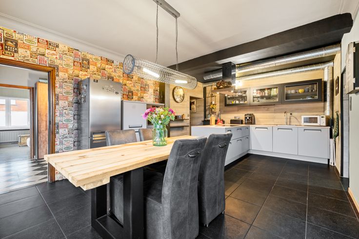 We komen de woning binnen langs de zijdelings gelegen inkom. Via de inkomhal komen we in de recente leefkeuken met ontbijtgelegenheid en eveneens voorzien van alle hedendaagse toestellen alsook comfort. Verder geeft de keuken toegang tot een kelderberging, apart gastentoilet en recente badkamer met wasplaats. Vooraan de woning treffen we een gezellige zithoek.