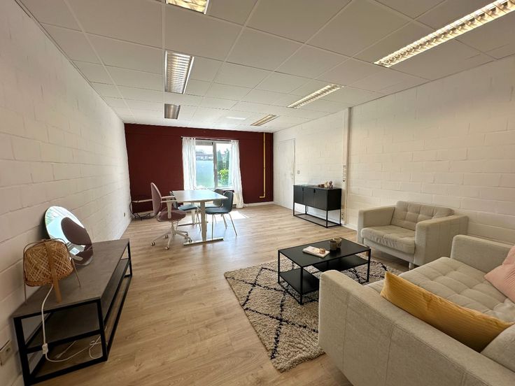 Het gelijkvloers, welk momenteel uitgebaat en verhuurd wordt als burelen, heeft een oppervlakte van +/- 225m² en bestaat uit: inkomhal/ontvangstruimte, diverse kantoren, sanitair, cv-lokaal, kitchenette en terras. Op het verdiep treffen we nog een extra vergaderruimte. Bijkomstig zijn hier 8 parkeerplaatsen voorzien, waarvan 1 in een afgesloten garage.